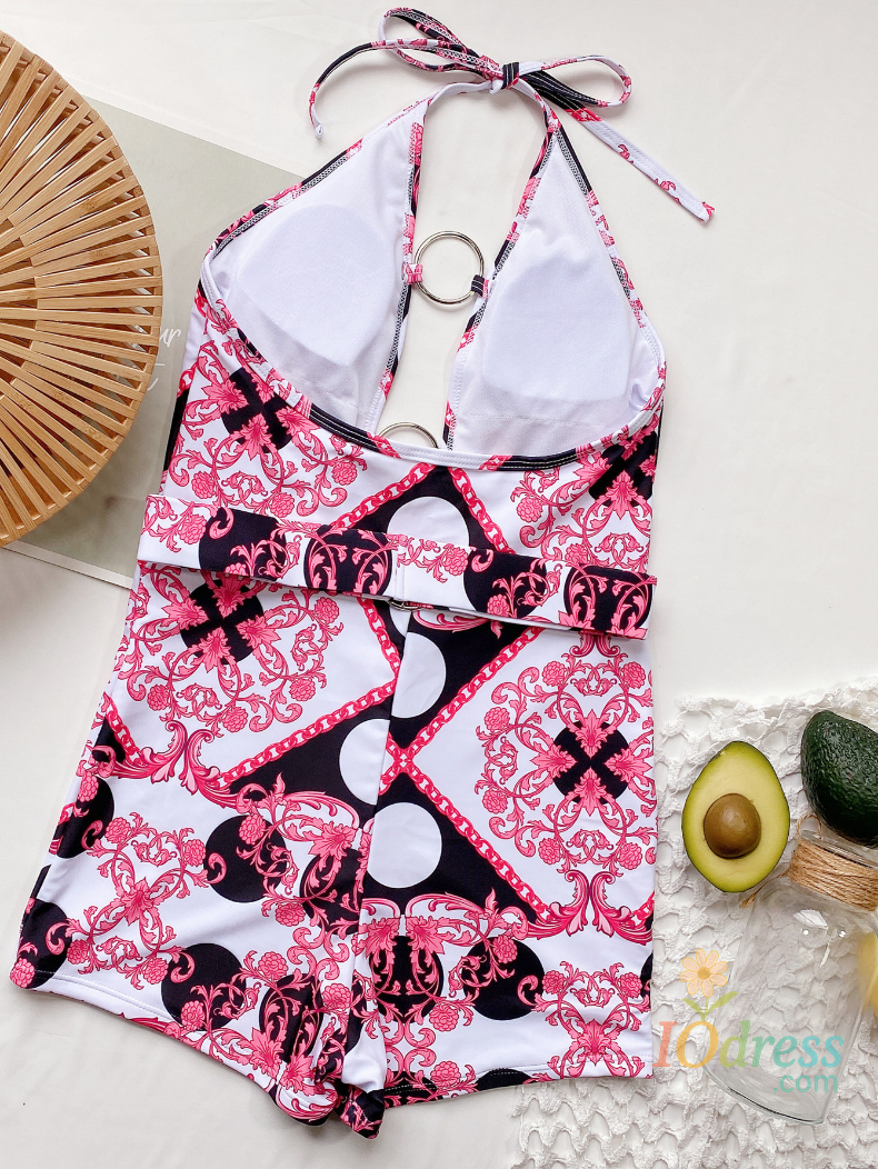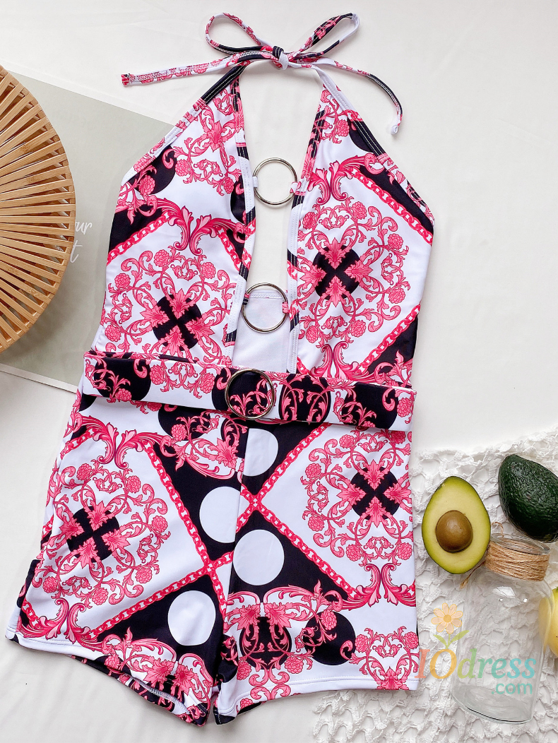 2 Colors Sexy One Piece Swimsuit Swimwear Women Vintage Retro Print Metal Ring Hollow Deep V-neck Halter Bathing Suit Beachwear
