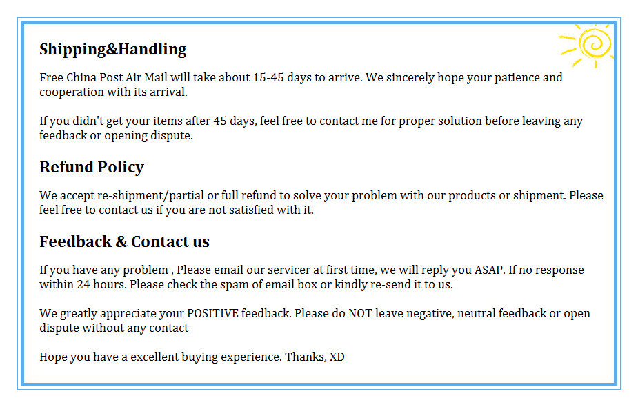 Please contact us within 5 months since shipment if no receipt or delivery, our representative will resolve this problem within 24 hours. Note that overdue requests may not be accepted.