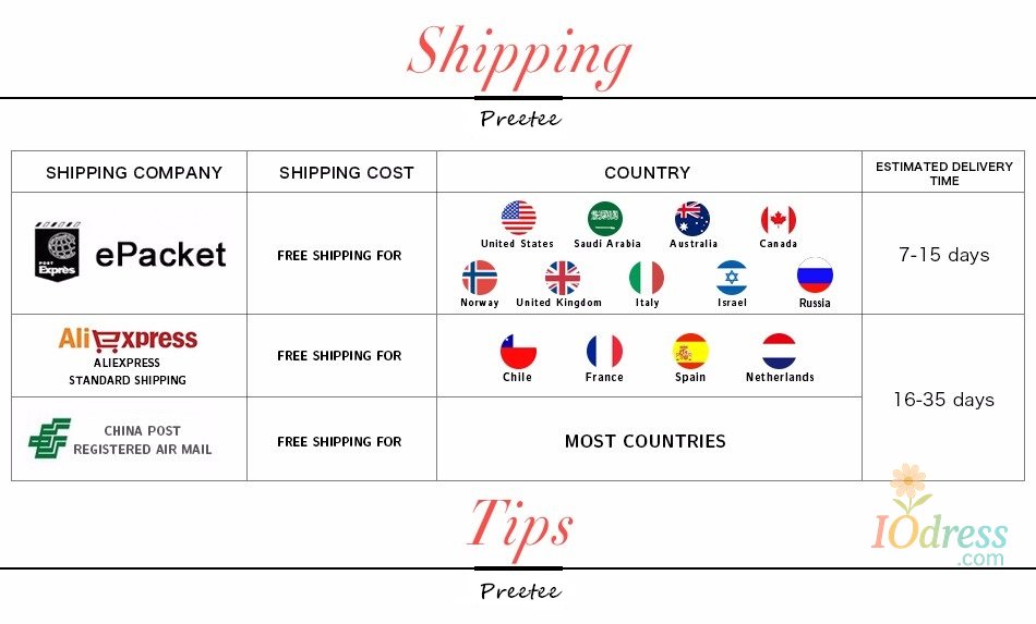 2. Processing time: In order to guarantee the quality of our products, Iodress.com has to prepare your goods carefully before they are shipped out. Our professionally trained technicians perform strict in-house quality control checks on all products and carefully package your items to ensure they arrive in excellent condition.