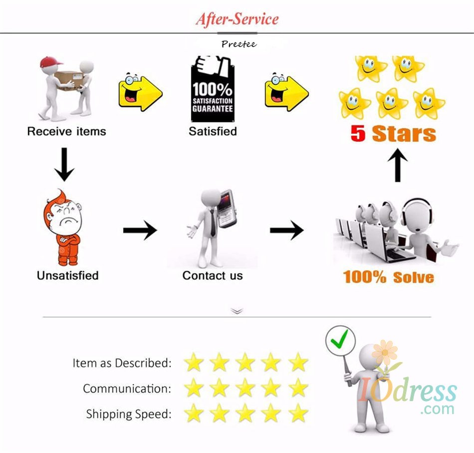 IO Dress is not liable for problems under the following: Wrong size or color picked; Customer‘s subjective factors and just dislikes the item. Return shipping fees and the shipping fees from IO Dress to customer are at customer's own expense.
