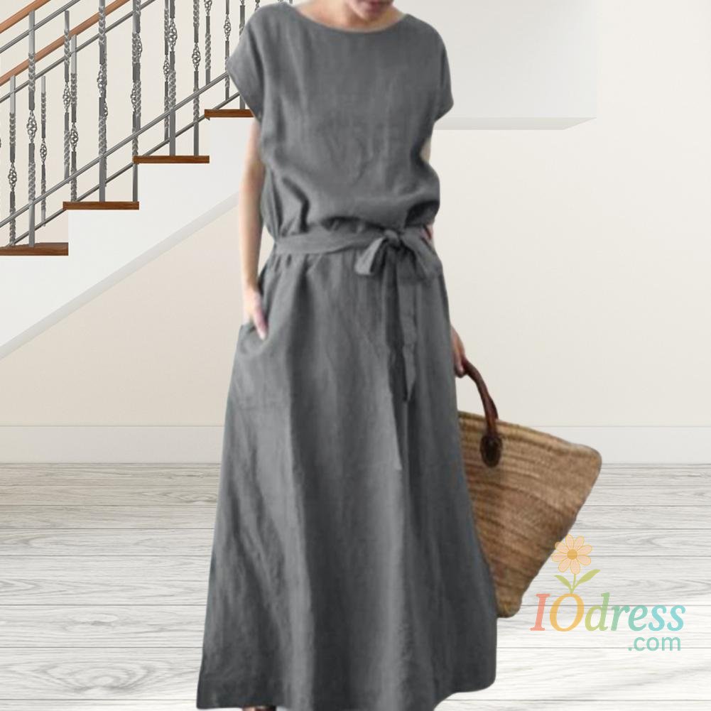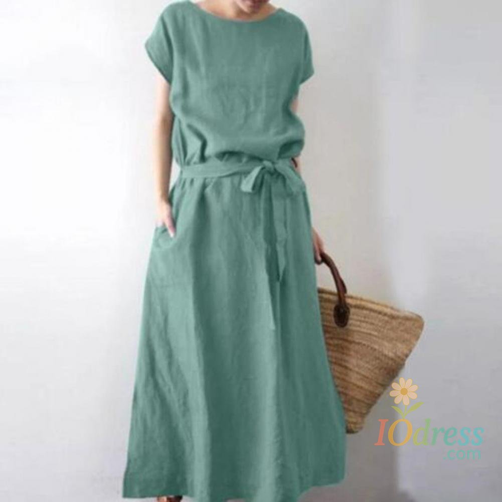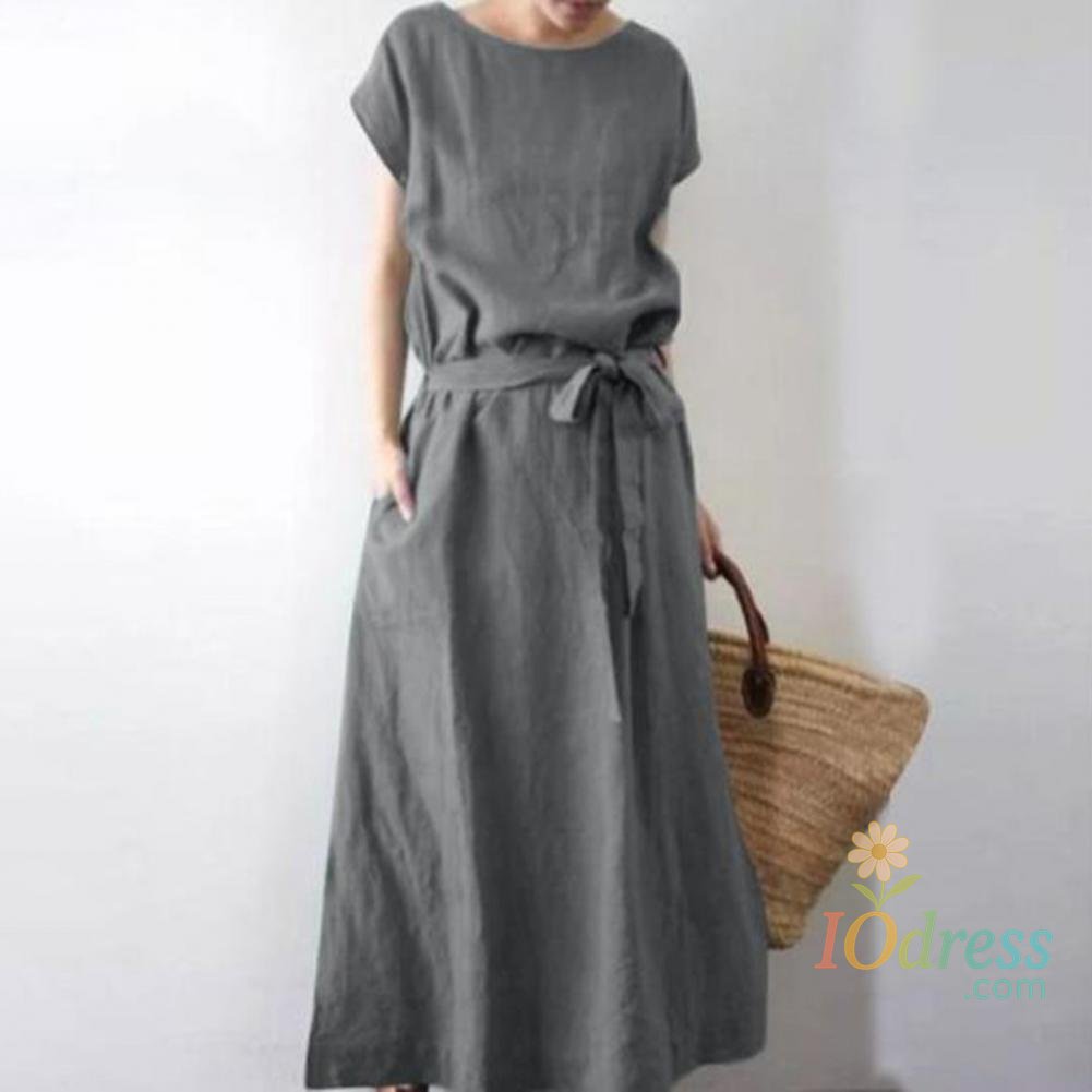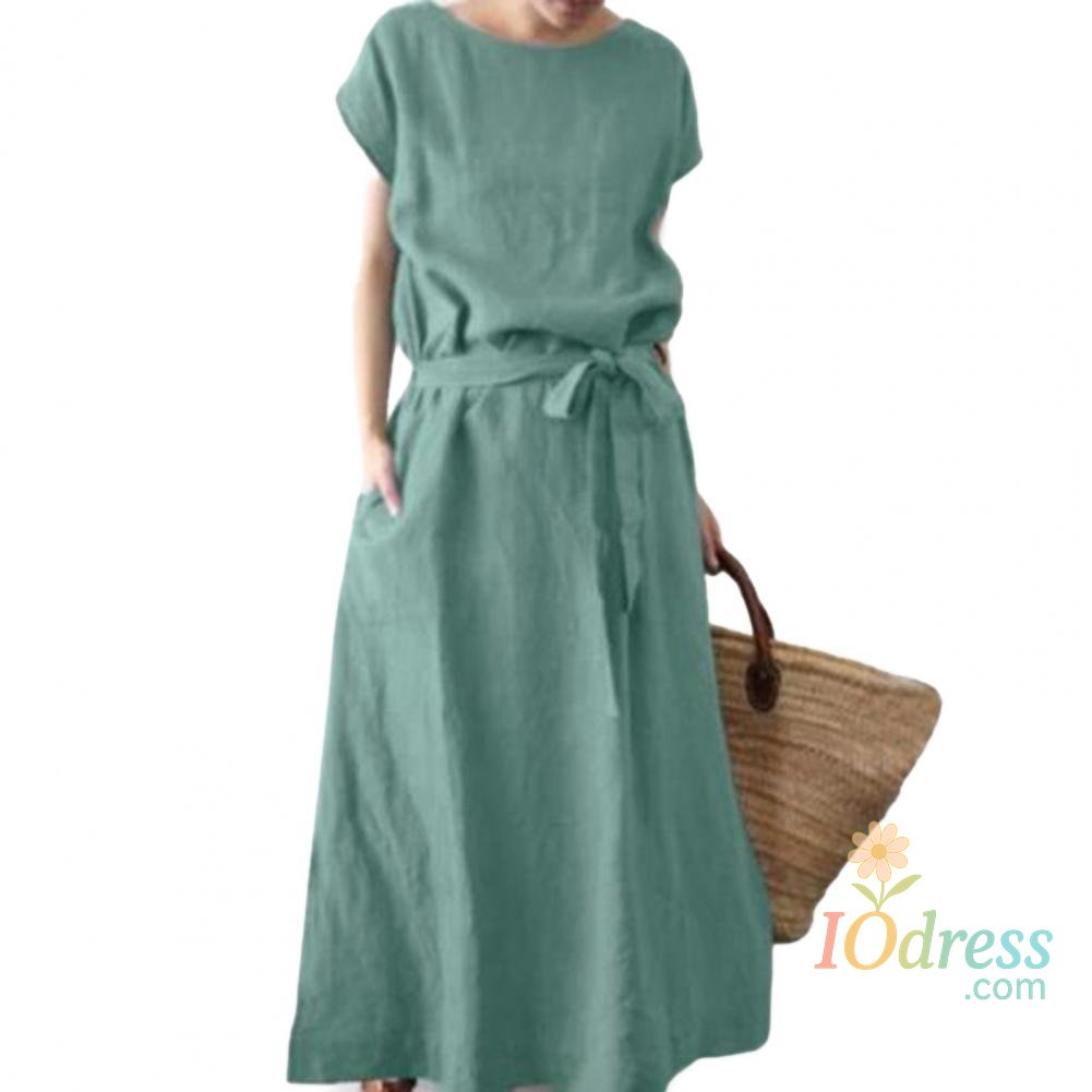 Women's Boho Cotton Linen Maxi Dress Summer Short Sleeve Round Neck Long Dress with Belt And Pockets Casual Beach Sundress