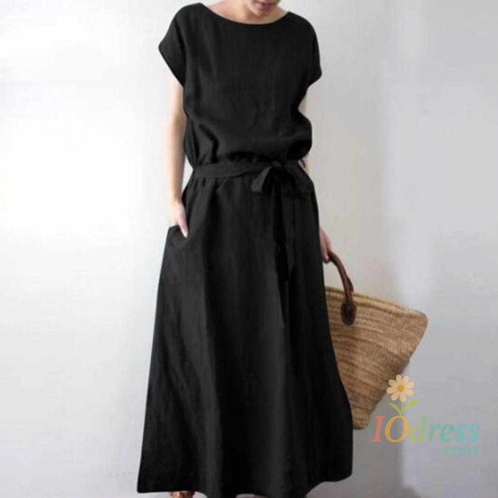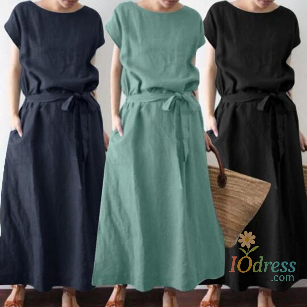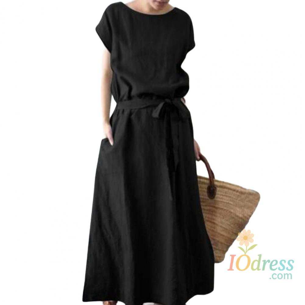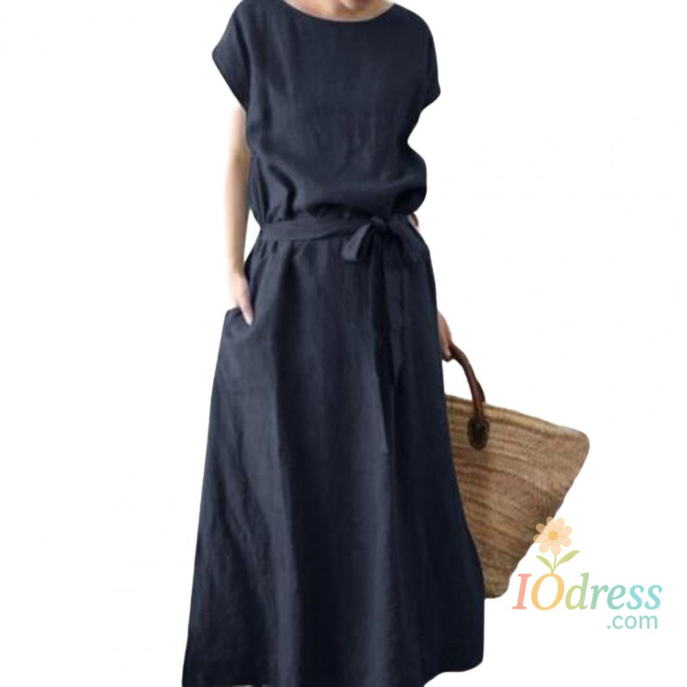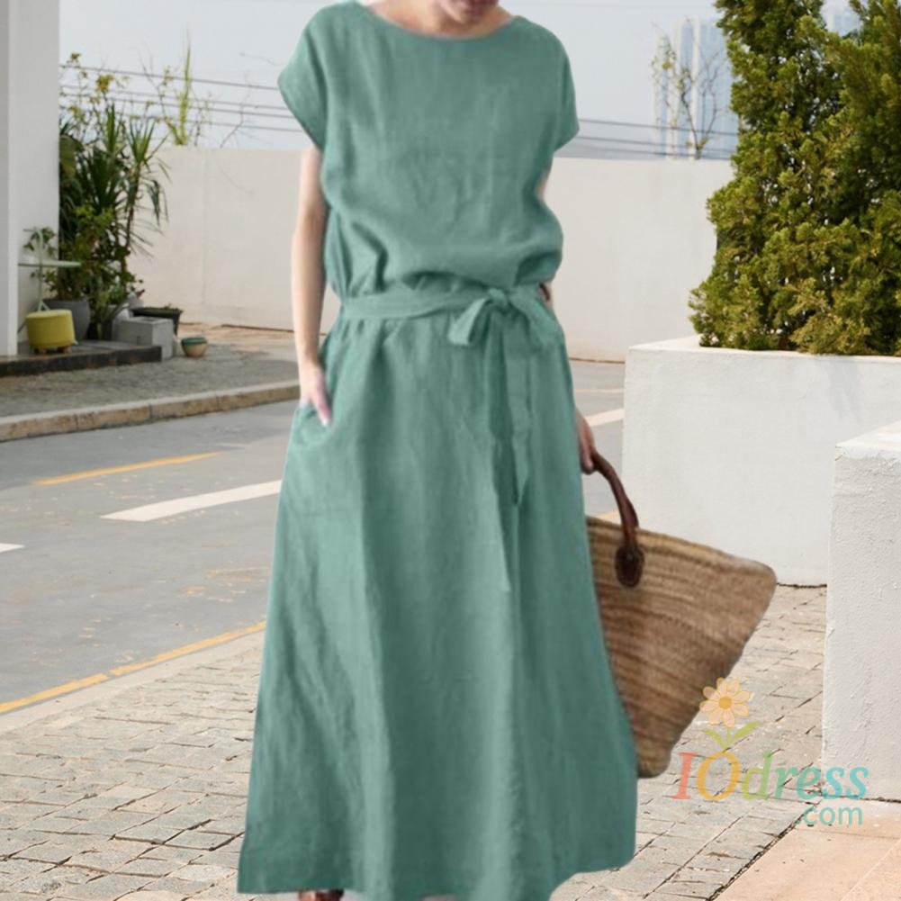 Women's Boho Cotton Linen Maxi Dress Summer Short Sleeve Round Neck Long Dress with Belt And Pockets Casual Beach Sundress