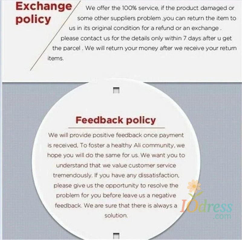 3) PO Box is not accepted if you choose express shipping. Your address should be detailed enough, even include apartment or unit number. Nondelivery or extra shipping fee due to personal reasons will not be taken by Iodress.com.