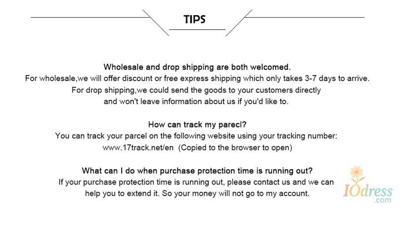 3) PO Box is not accepted if you choose express shipping. Your address should be detailed enough, even include apartment or unit number. Nondelivery or extra shipping fee due to personal reasons will not be taken by Iodress.com.