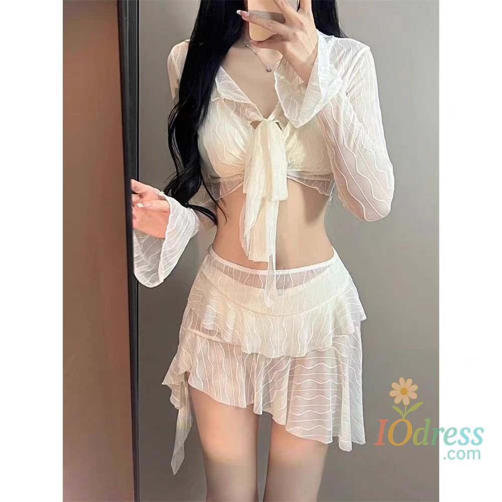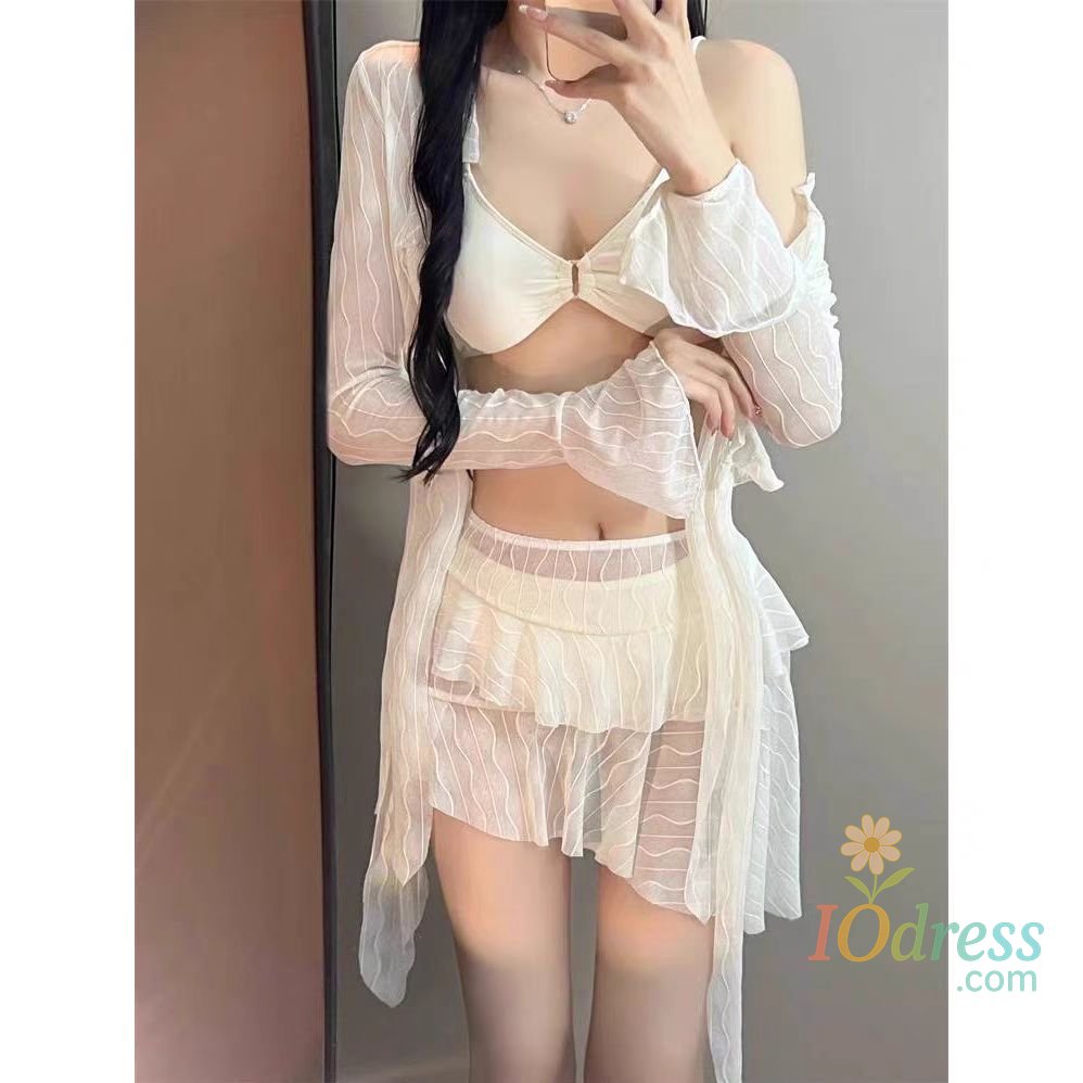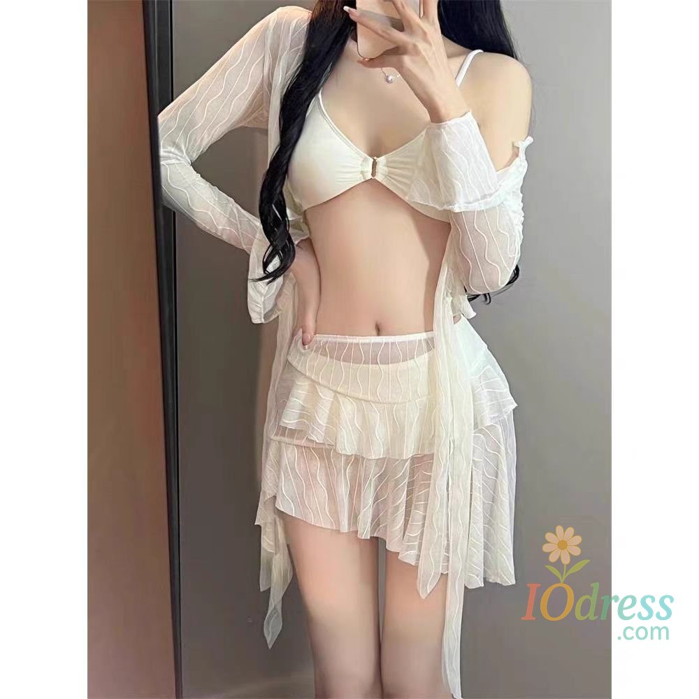 This four-piece set includes a long-sleeve top and bottom, perfect for various water activities like swimming and sunbathing.