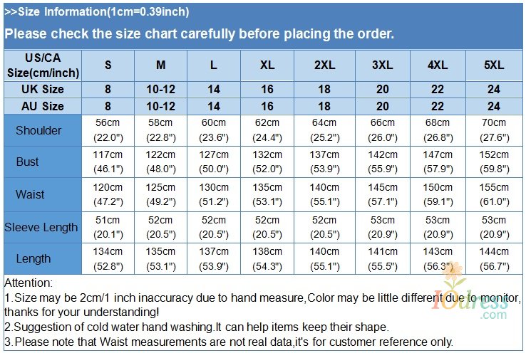 Package included: 1 Dress Notes: 1. The actual color of the item may differ slightly from the pictures due to lighting and display settings. 2. All measurements are done manually, so there may be a 1-3 cm discrepancy. 3. Please refer to the size chart before purchasing.