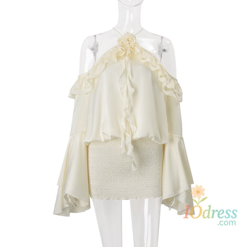 Women's Halter Mini Dress Long Sleeve Backless 3D Flower Solid Color Dress Smocked Party Dress