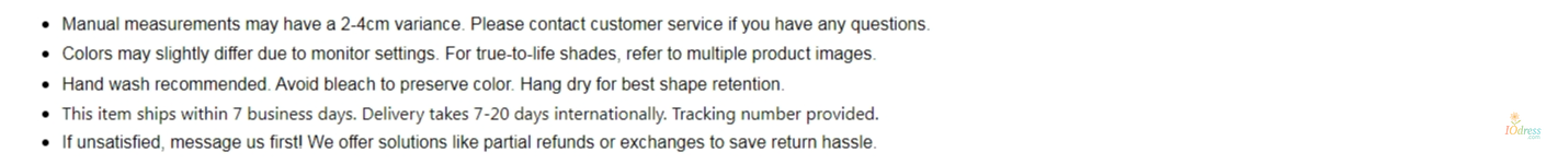 IO Dress is not liable for problems under the following: Wrong size or color picked; Customer‘s subjective factors and just dislikes the item. Return shipping fees and the shipping fees from IO Dress to customer are at customer's own expense.