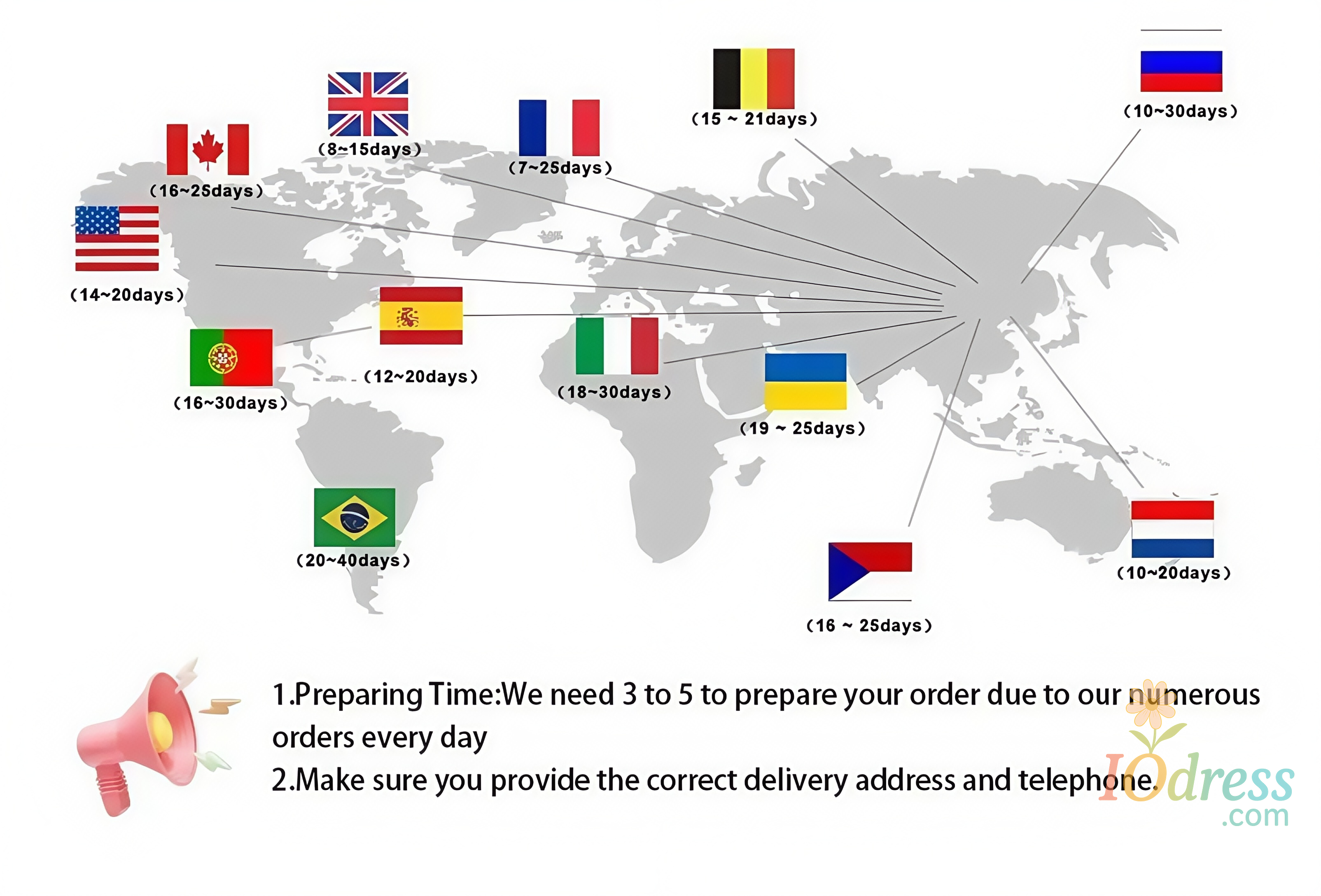 2. Processing time: In order to guarantee the quality of our products, Iodress.com has to prepare your goods carefully before they are shipped out. Our professionally trained technicians perform strict in-house quality control checks on all products and carefully package your items to ensure they arrive in excellent condition.