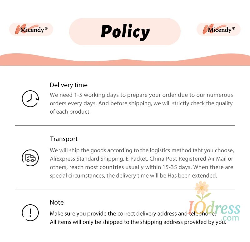 2. Processing time: In order to guarantee the quality of our products, Iodress.com has to prepare your goods carefully before they are shipped out. Our professionally trained technicians perform strict in-house quality control checks on all products and carefully package your items to ensure they arrive in excellent condition.