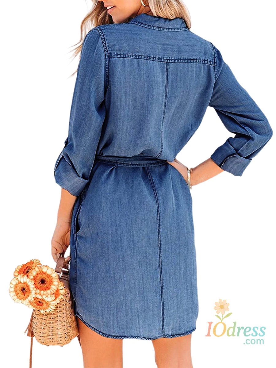 Women Casual Dress, Solid Color Long Sleeve Button-Down Lapel Short Dress with Belt