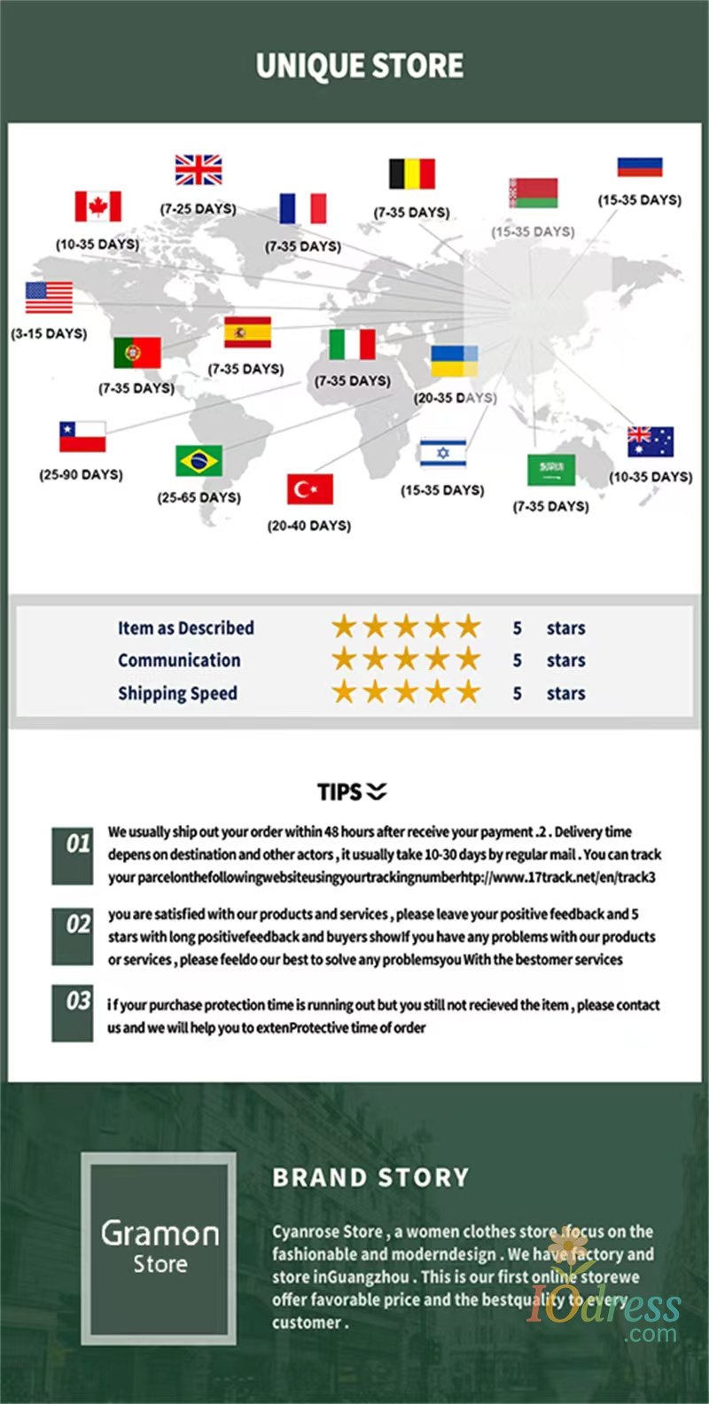 3) PO Box is not accepted if you choose express shipping. Your address should be detailed enough, even include apartment or unit number. Nondelivery or extra shipping fee due to personal reasons will not be taken by Iodress.com.