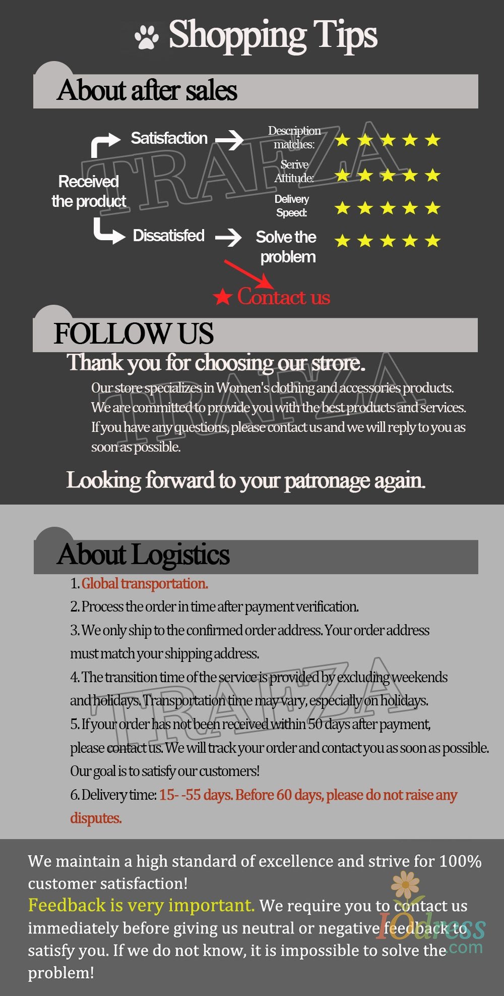3) PO Box is not accepted if you choose express shipping. Your address should be detailed enough, even include apartment or unit number. Nondelivery or extra shipping fee due to personal reasons will not be taken by Iodress.com.