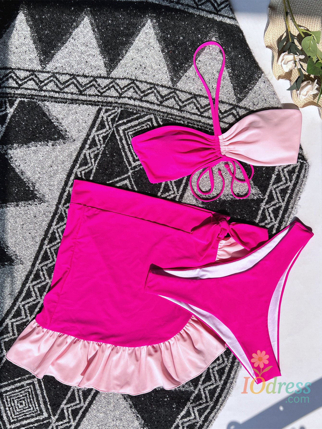 Hot Pink Patchwork Bikini Set 2024 Women Pleate Push Up Ruffles Skirt Swimsuit Beach Bathing Suit High Waist 3 Piece Swimwear