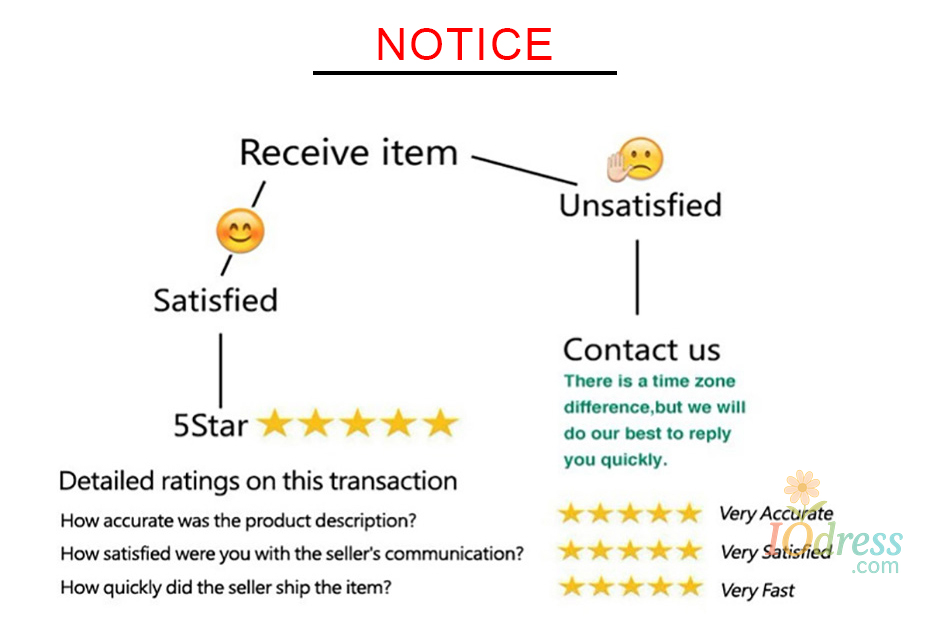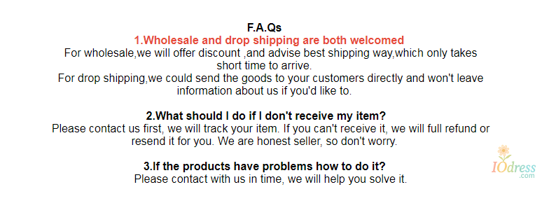 3) PO Box is not accepted if you choose express shipping. Your address should be detailed enough, even include apartment or unit number. Nondelivery or extra shipping fee due to personal reasons will not be taken by Iodress.com.