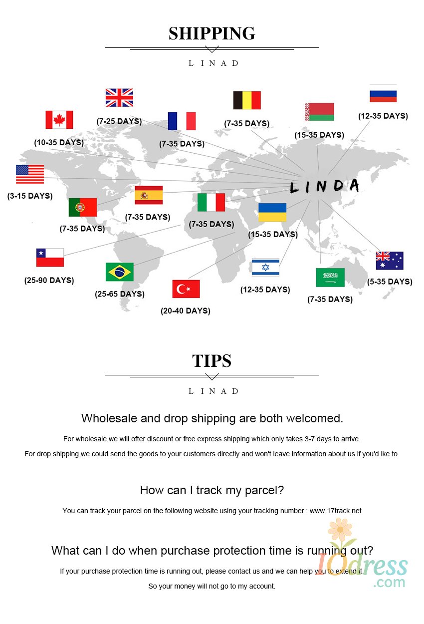 2. Processing time: In order to guarantee the quality of our products, Iodress.com has to prepare your goods carefully before they are shipped out. Our professionally trained technicians perform strict in-house quality control checks on all products and carefully package your items to ensure they arrive in excellent condition.