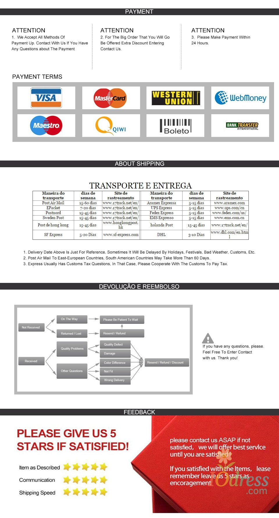3) PO Box is not accepted if you choose express shipping. Your address should be detailed enough, even include apartment or unit number. Nondelivery or extra shipping fee due to personal reasons will not be taken by Iodress.com.
