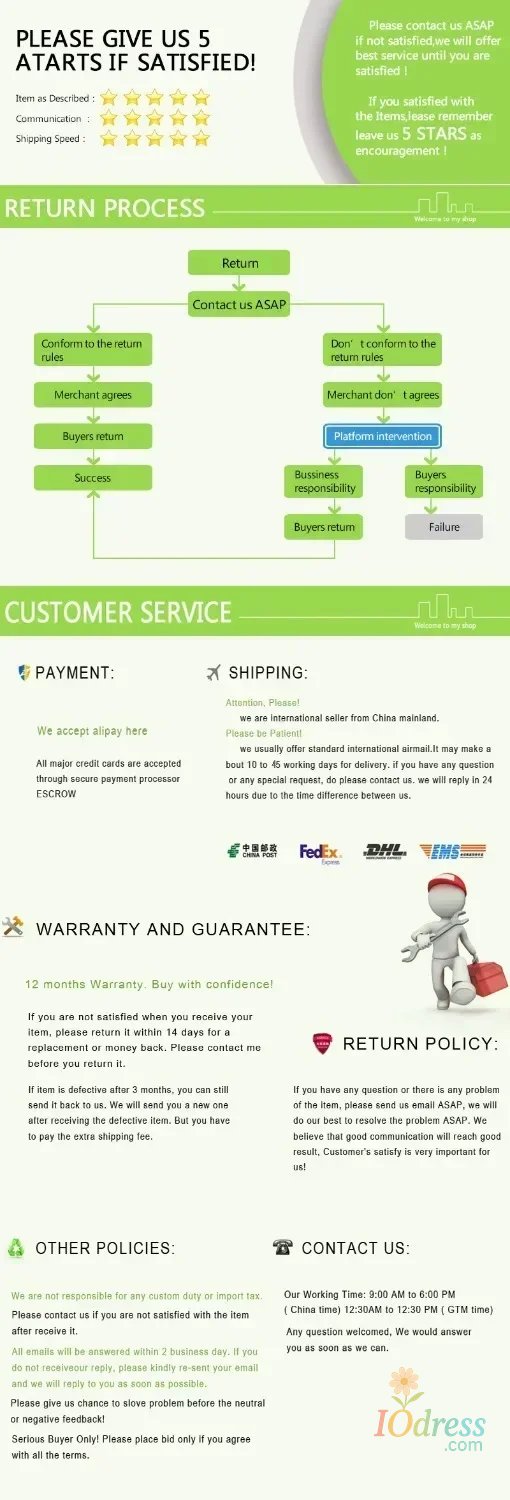 3) PO Box is not accepted if you choose express shipping. Your address should be detailed enough, even include apartment or unit number. Nondelivery or extra shipping fee due to personal reasons will not be taken by Iodress.com.