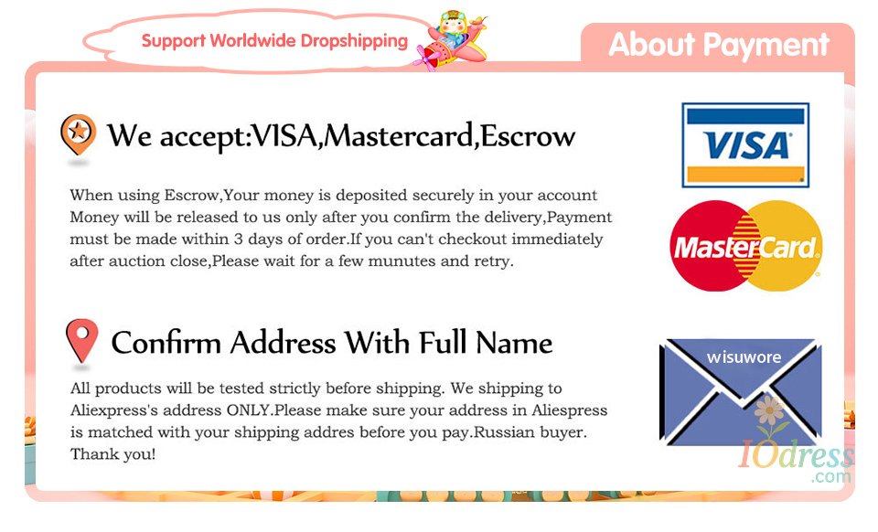 3) PO Box is not accepted if you choose express shipping. Your address should be detailed enough, even include apartment or unit number. Nondelivery or extra shipping fee due to personal reasons will not be taken by Iodress.com.