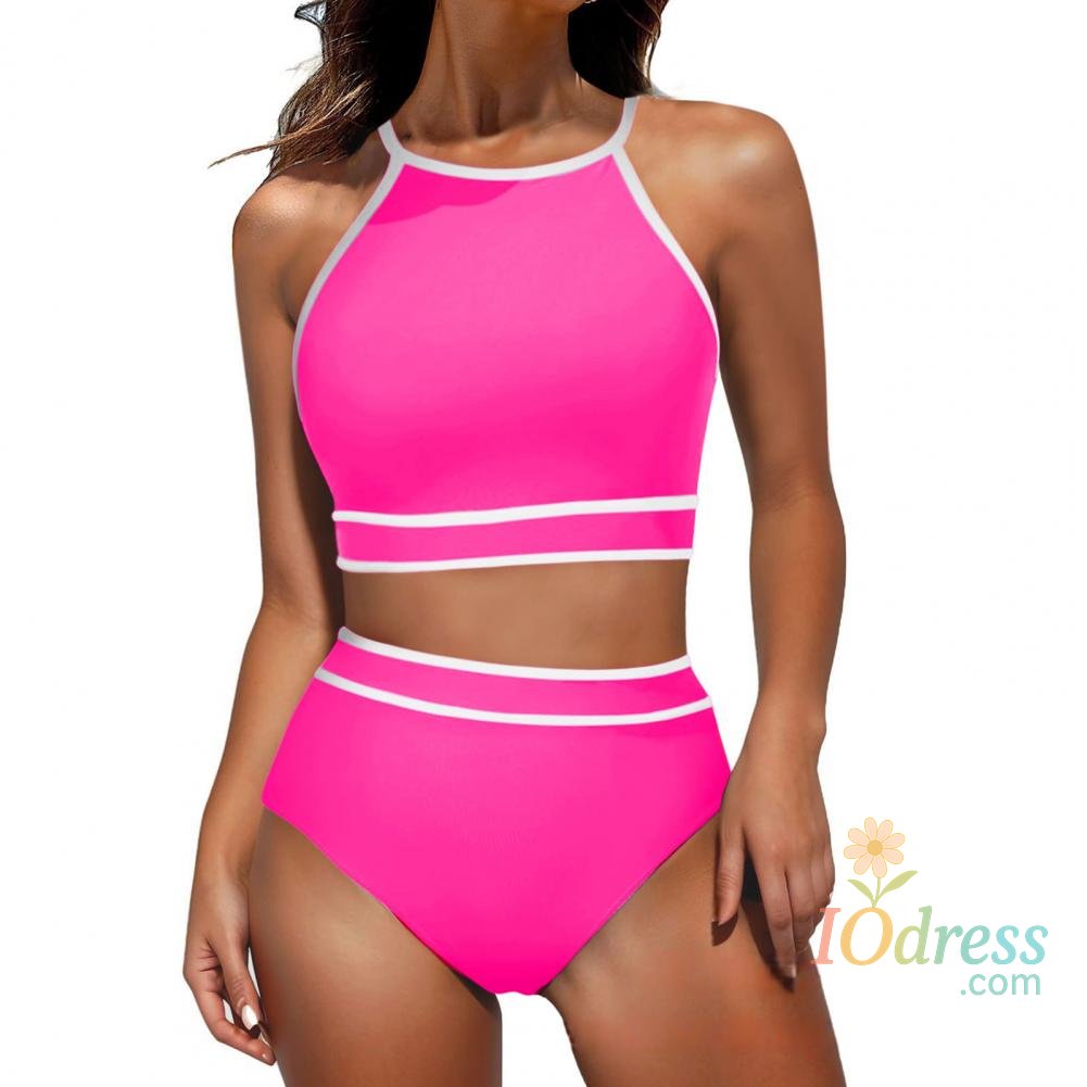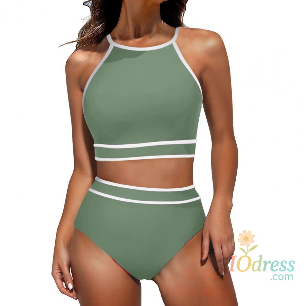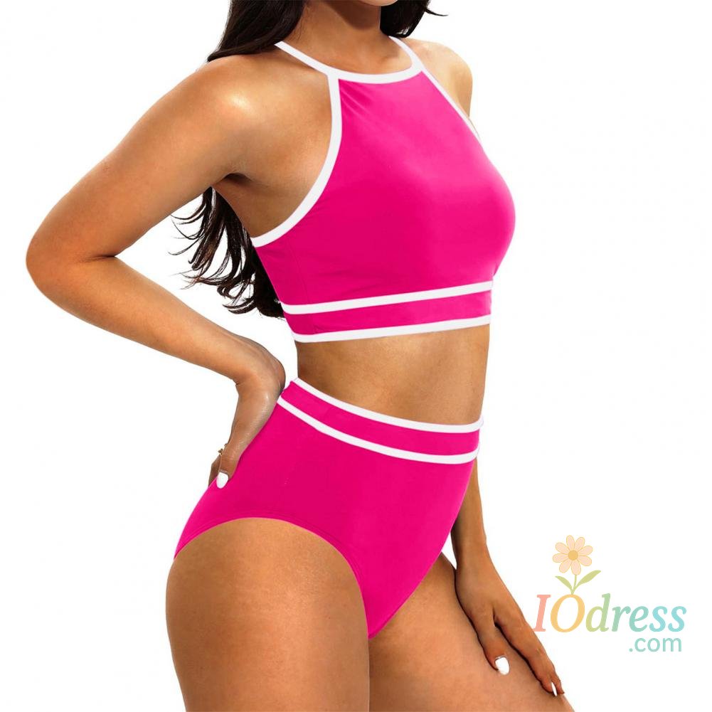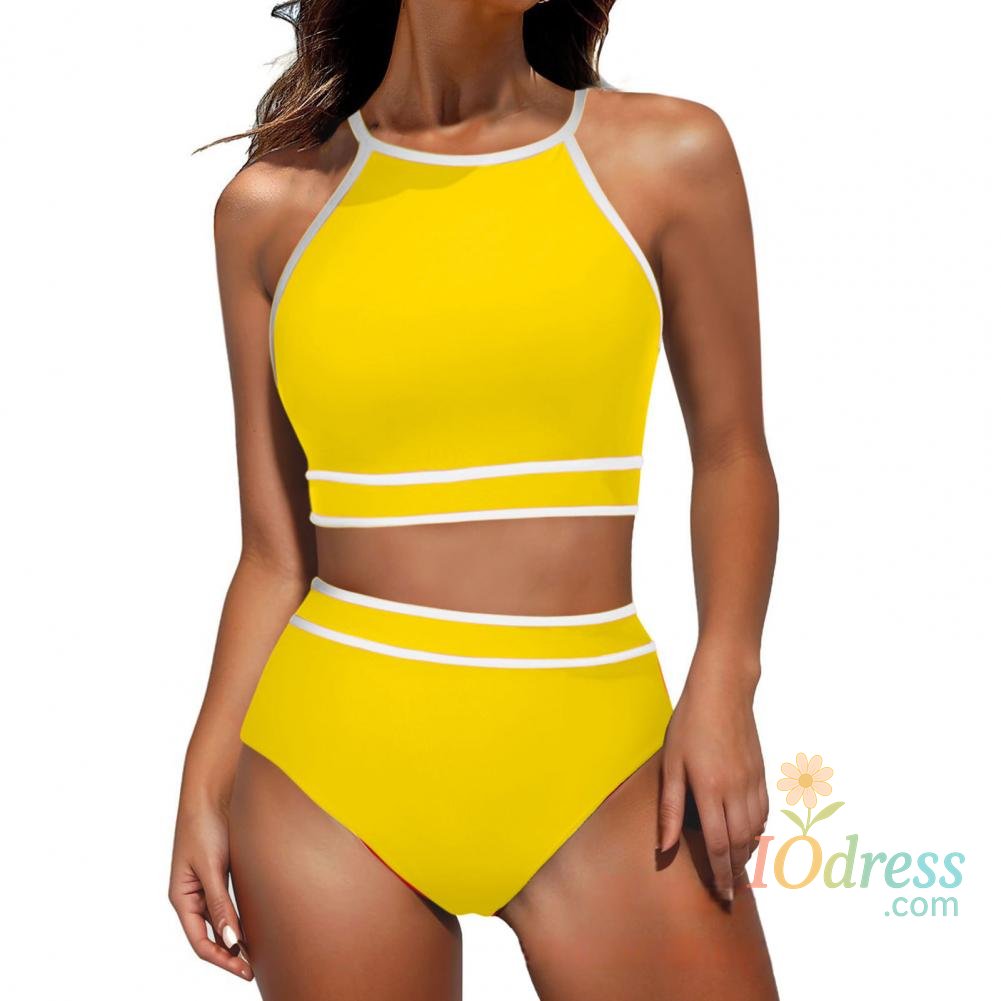 2Pcs/Set Women Bikini Set Halter Racer Back Bra High Waist Swimming Briefs Set Sporty Color Block Swimsuit