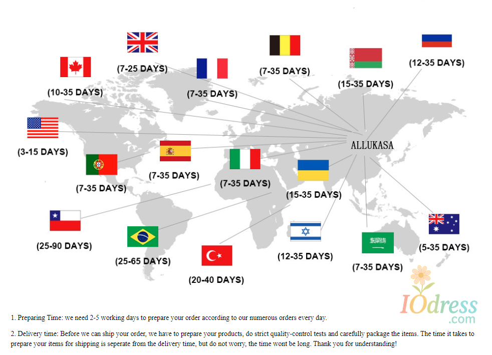 2. Processing time: In order to guarantee the quality of our products, Iodress.com has to prepare your goods carefully before they are shipped out. Our professionally trained technicians perform strict in-house quality control checks on all products and carefully package your items to ensure they arrive in excellent condition.