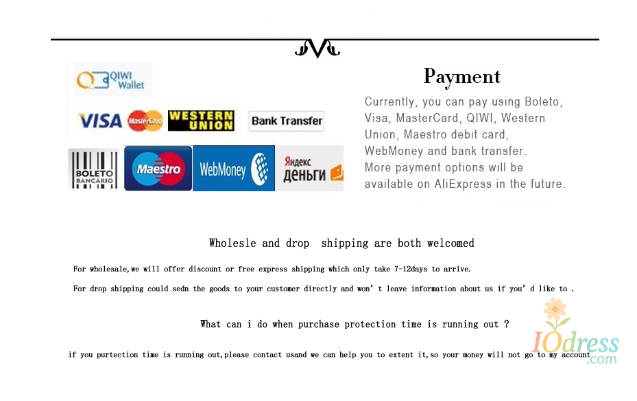 3) PO Box is not accepted if you choose express shipping. Your address should be detailed enough, even include apartment or unit number. Nondelivery or extra shipping fee due to personal reasons will not be taken by Iodress.com.