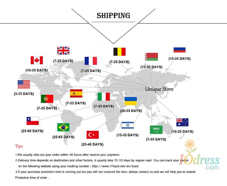 2. Processing time: In order to guarantee the quality of our products, Iodress.com has to prepare your goods carefully before they are shipped out. Our professionally trained technicians perform strict in-house quality control checks on all products and carefully package your items to ensure they arrive in excellent condition.