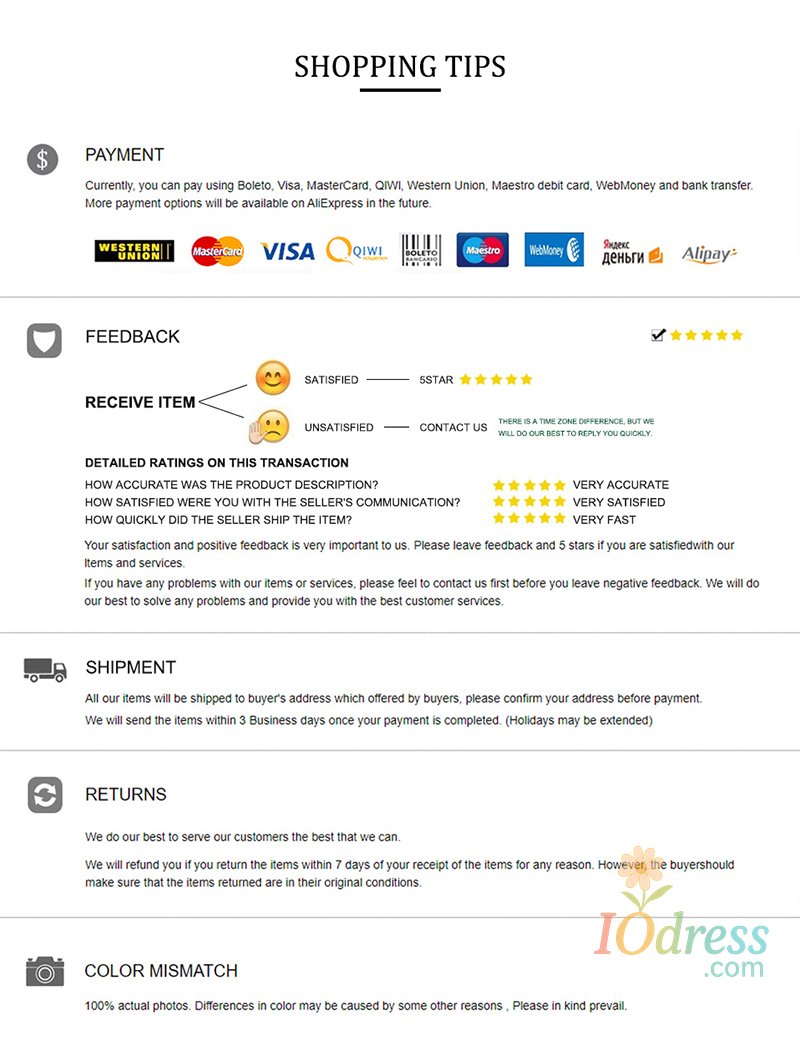 3) PO Box is not accepted if you choose express shipping. Your address should be detailed enough, even include apartment or unit number. Nondelivery or extra shipping fee due to personal reasons will not be taken by Iodress.com.