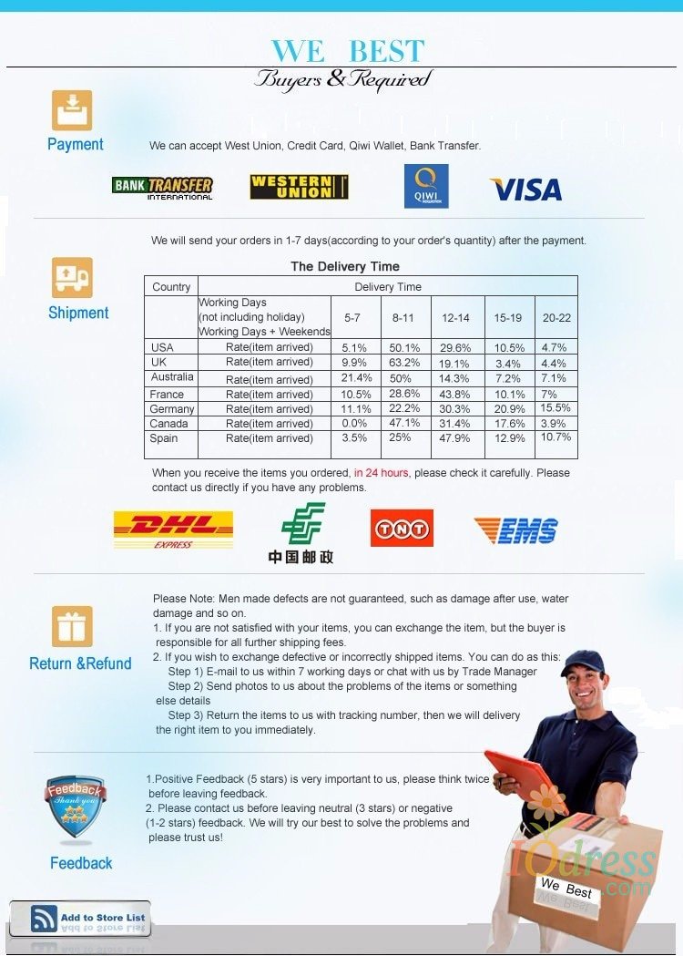 3) PO Box is not accepted if you choose express shipping. Your address should be detailed enough, even include apartment or unit number. Nondelivery or extra shipping fee due to personal reasons will not be taken by Iodress.com.