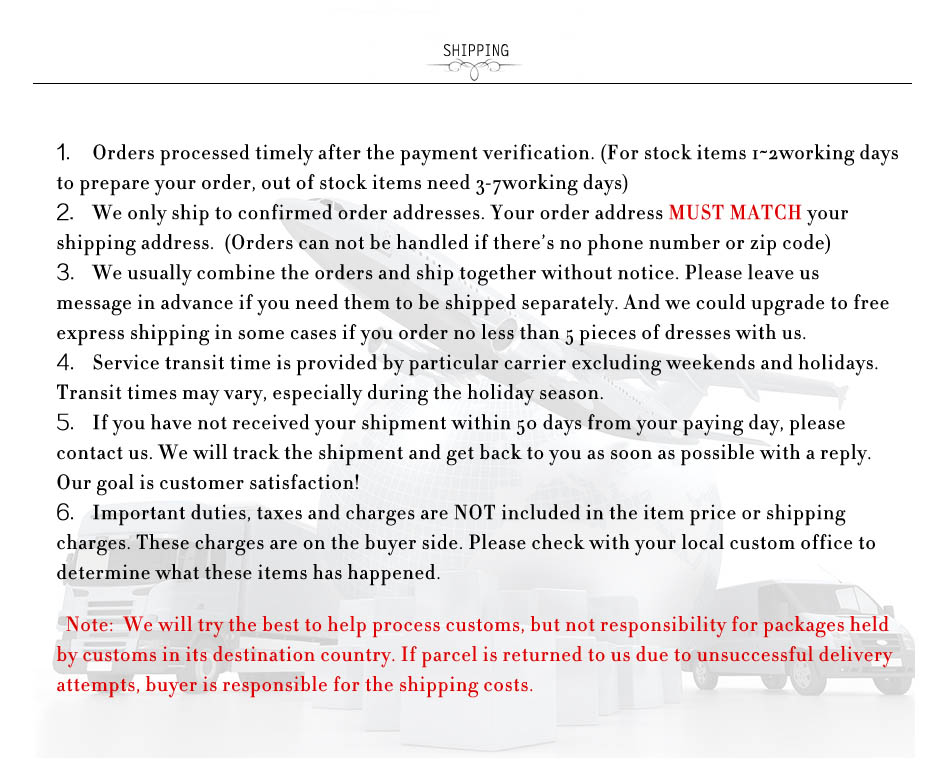 3) PO Box is not accepted if you choose express shipping. Your address should be detailed enough, even include apartment or unit number. Nondelivery or extra shipping fee due to personal reasons will not be taken by Iodress.com.