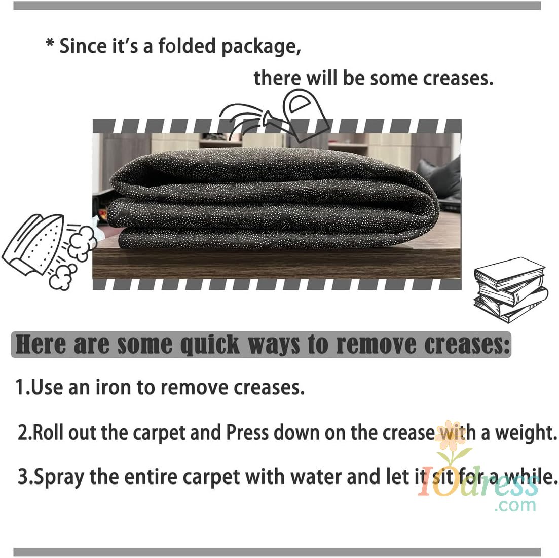 Due to the volume of the carpet is too large, it can only be packaged by folding. It is inevitable that there will be creases, which is not a quality problem. The crease will disappear over time, and it can also be solved by ironing. Hope you can understand.