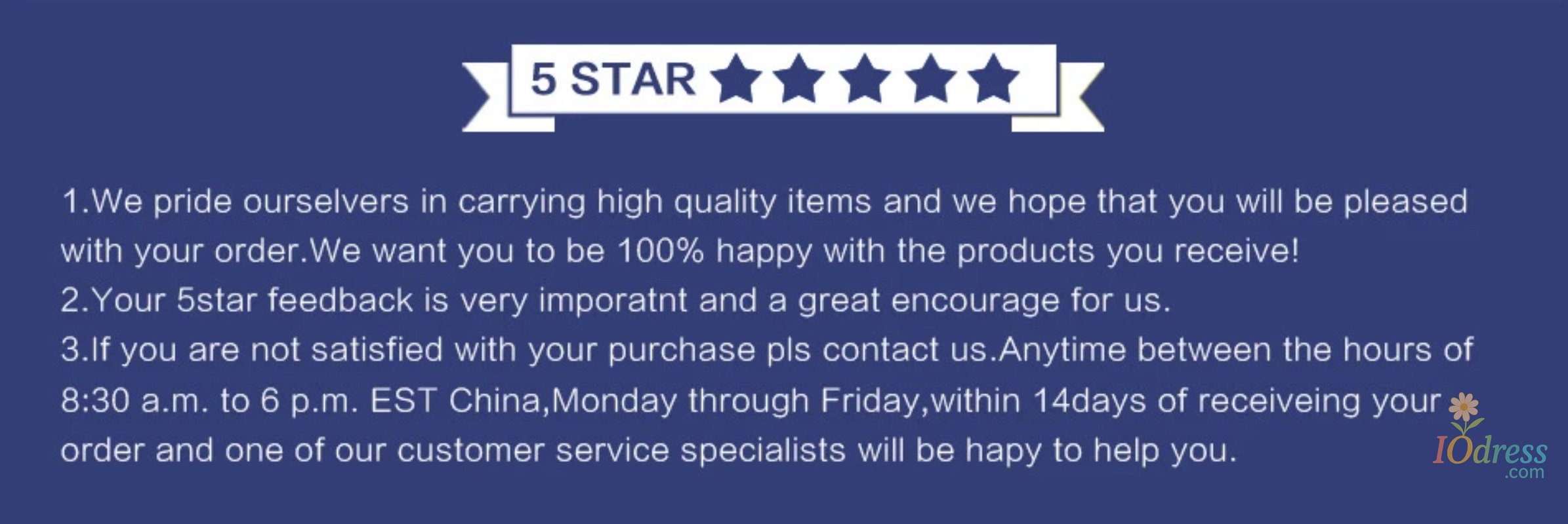 3) PO Box is not accepted if you choose express shipping. Your address should be detailed enough, even include apartment or unit number. Nondelivery or extra shipping fee due to personal reasons will not be taken by Iodress.com.