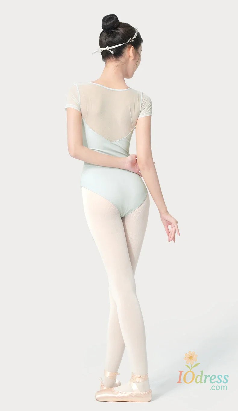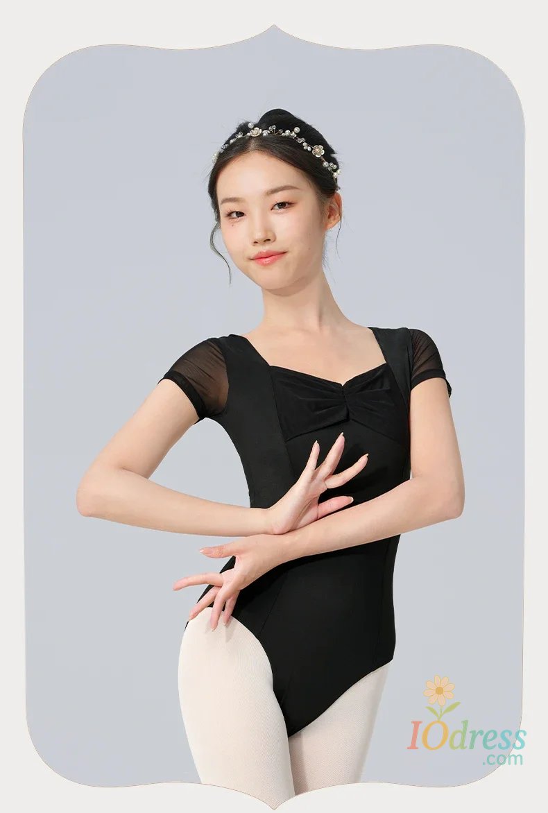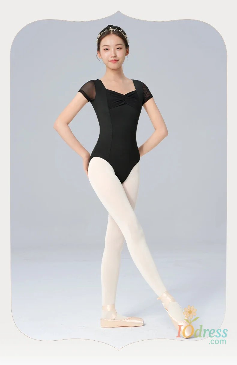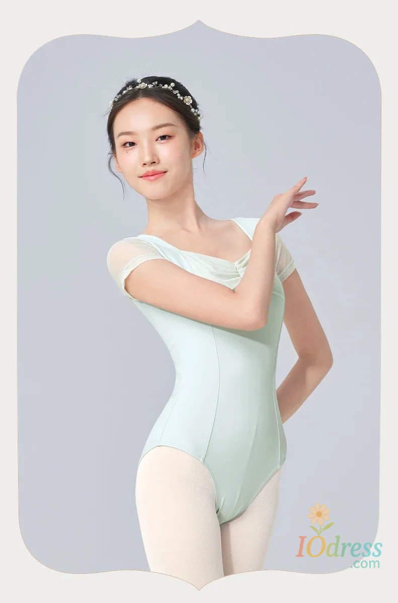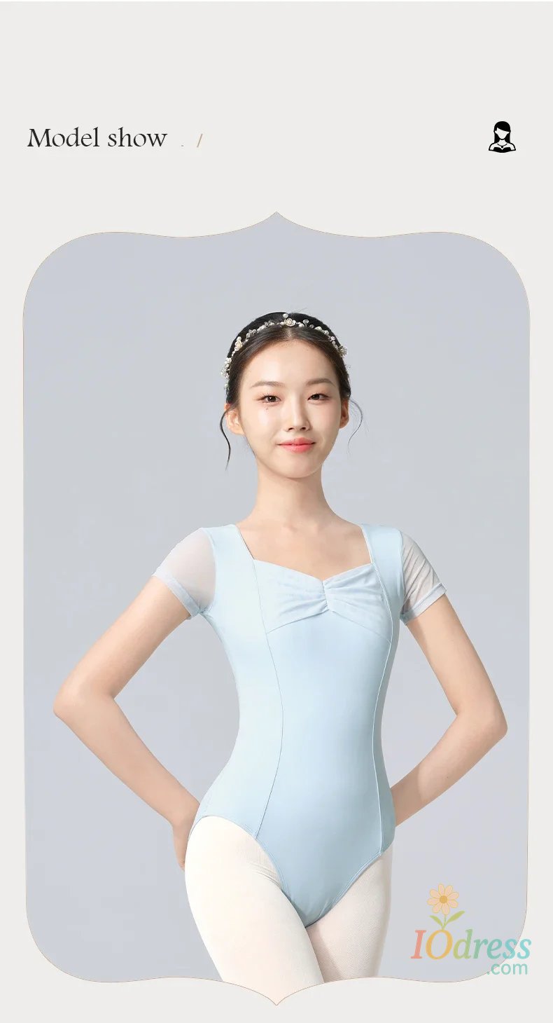 Women Ballet Leotards Pleating V-neck Gymnastics Uniform Mesh Splice Ballerina Dance Leotards Yoga Pilates Dancing Bodysuits