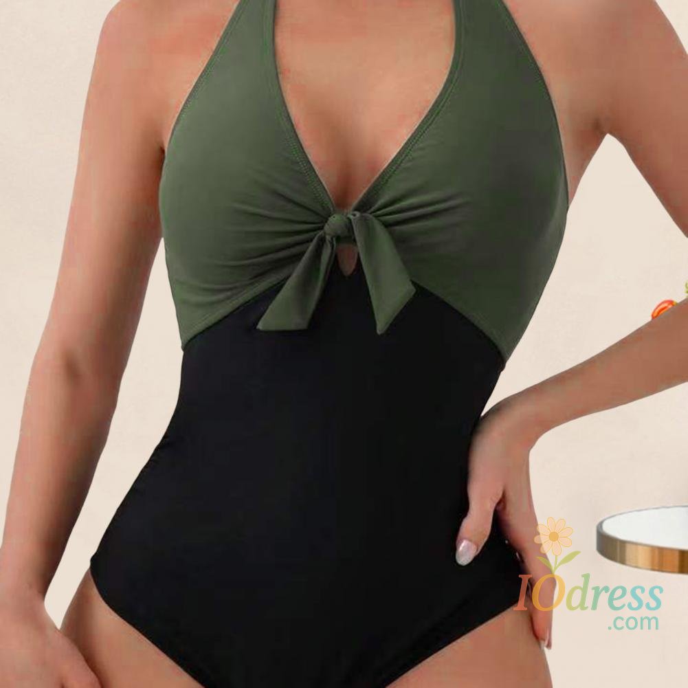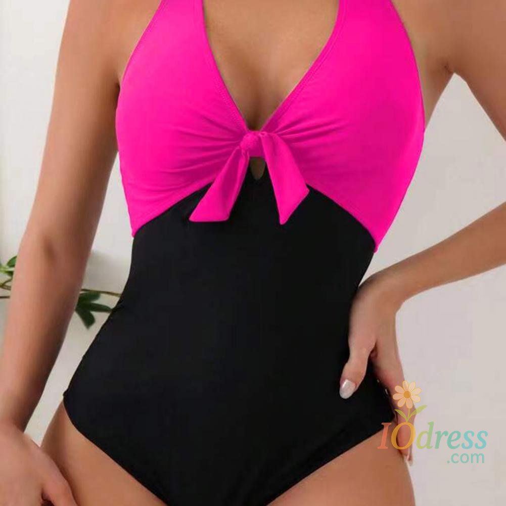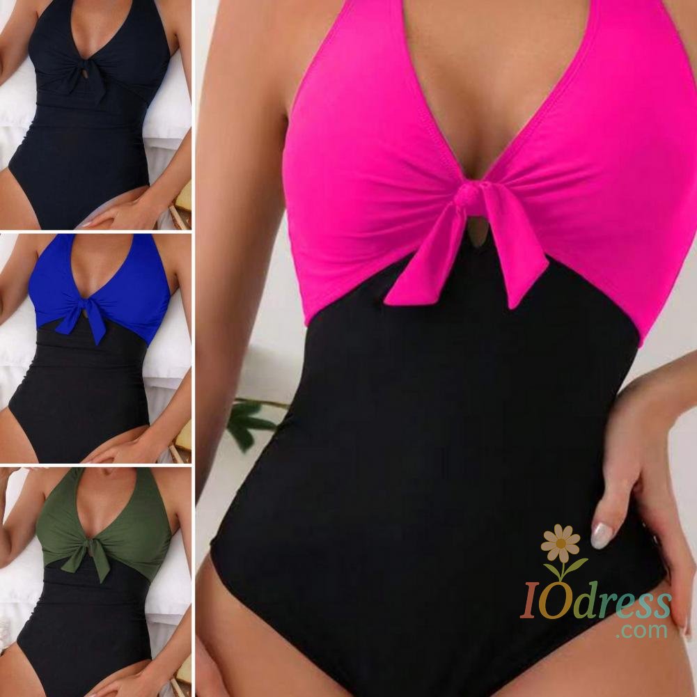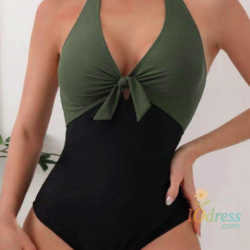 Women Sexy Summer Monokini Halter Deep V-Neck One-piece Swimsuit Patchwork Color Bowknot Decor High Waist Backless Beachwear