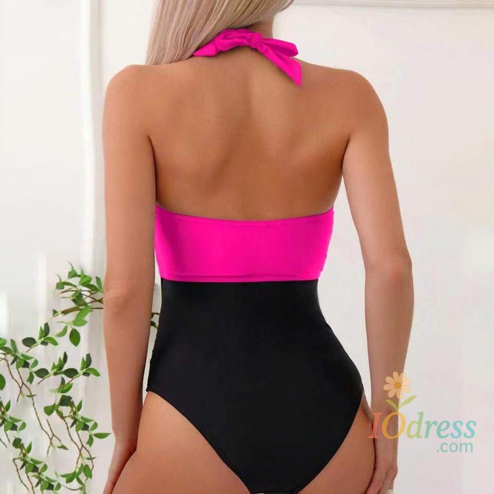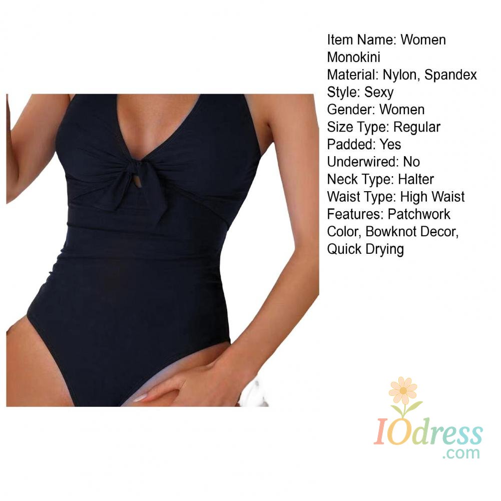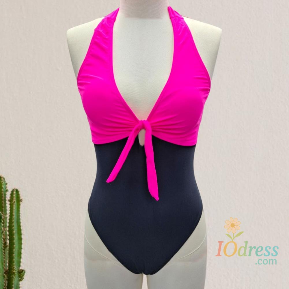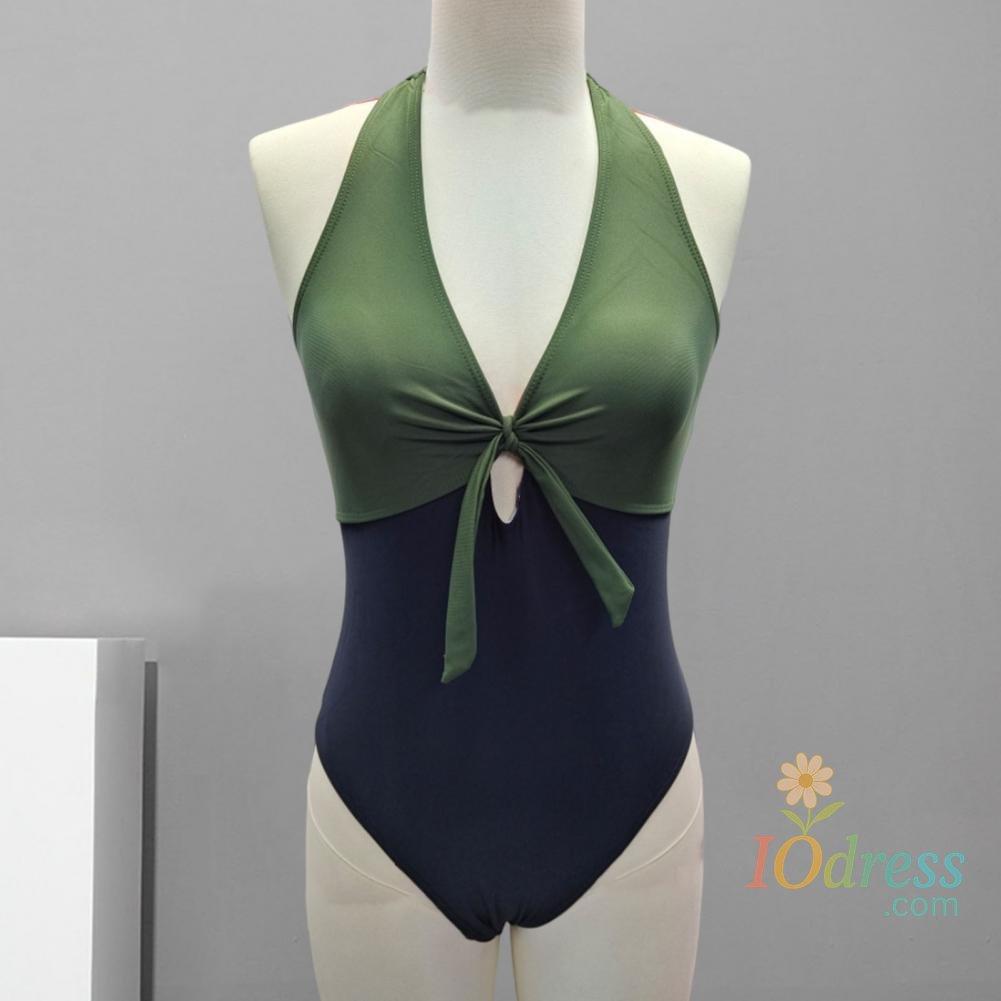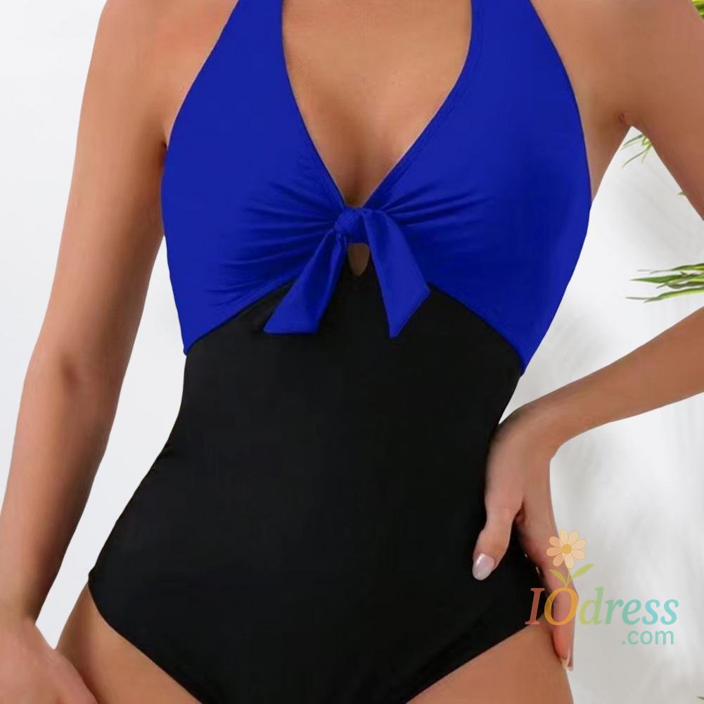Women Sexy Summer Monokini Halter Deep V-Neck One-piece Swimsuit Patchwork Color Bowknot Decor High Waist Backless Beachwear