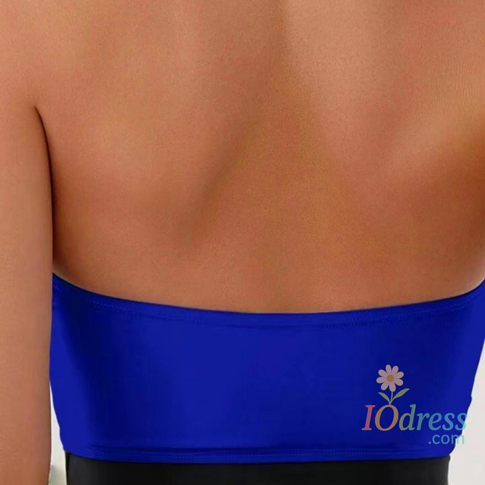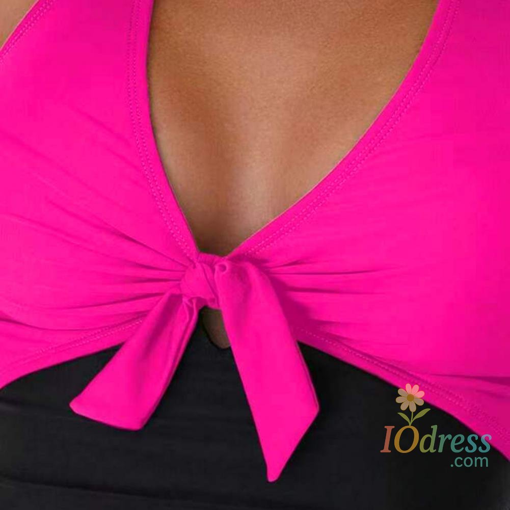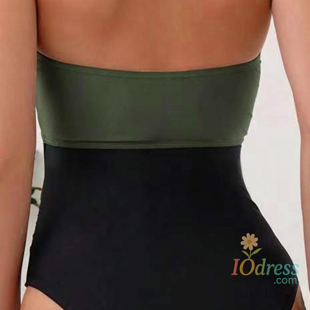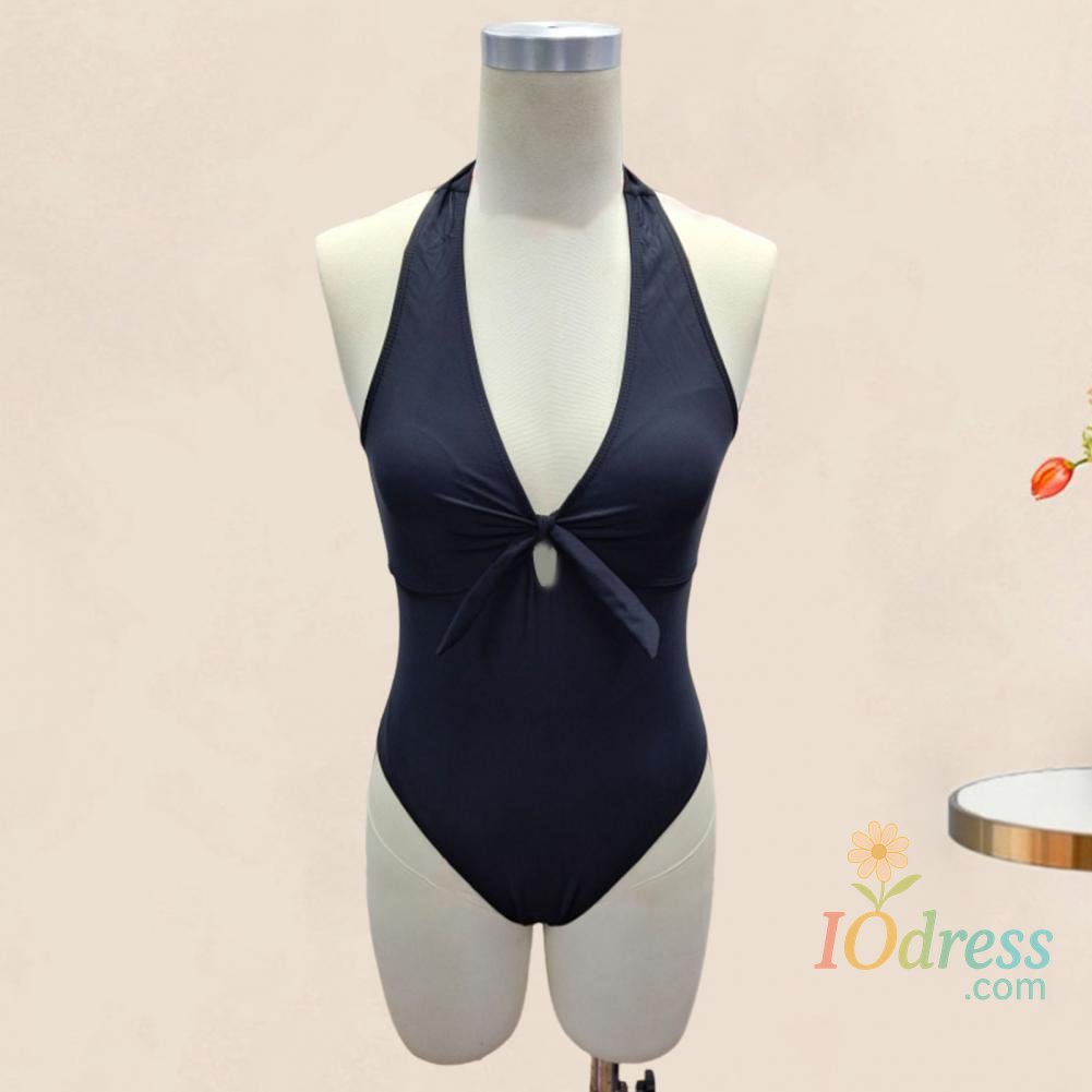 Women Sexy Summer Monokini Halter Deep V-Neck One-piece Swimsuit Patchwork Color Bowknot Decor High Waist Backless Beachwear