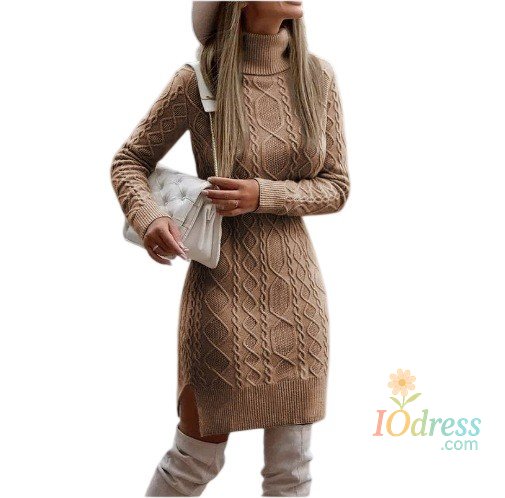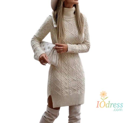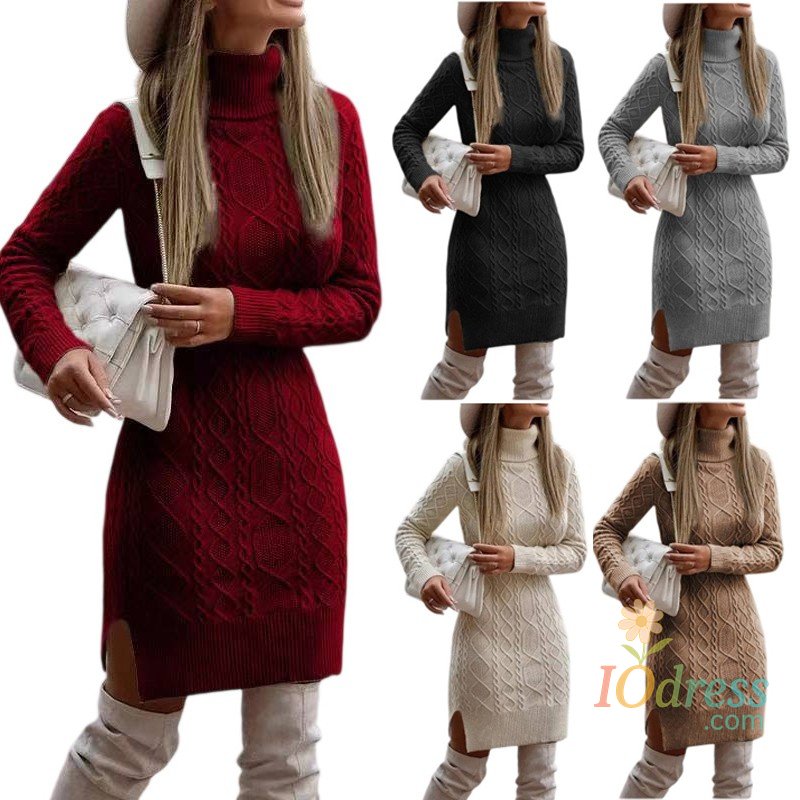 Women's Knitted Dress Turtleneck Winter Sweater Dress Knitted Dresses Midi Plain Long Wool Dress