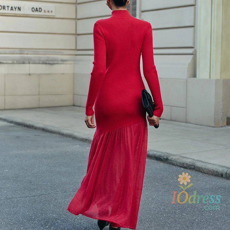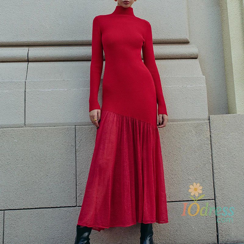 IO Dress Womens Turtleneck Patchwork Mesh Pleated Dress Hepburn Temperament Solid Slim Knitted Dress Fall Winter Long Sleeve Maxi Dresses